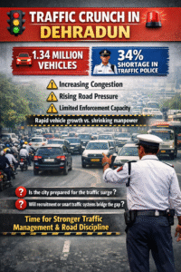 देहरादून में 13.4 लाख वाहन, ट्रैफिक पुलिस में 34% कमी; ‘ट्रैफिक सुनामी’ से निपटने को नागरिक मॉडल का प्रस्ताव